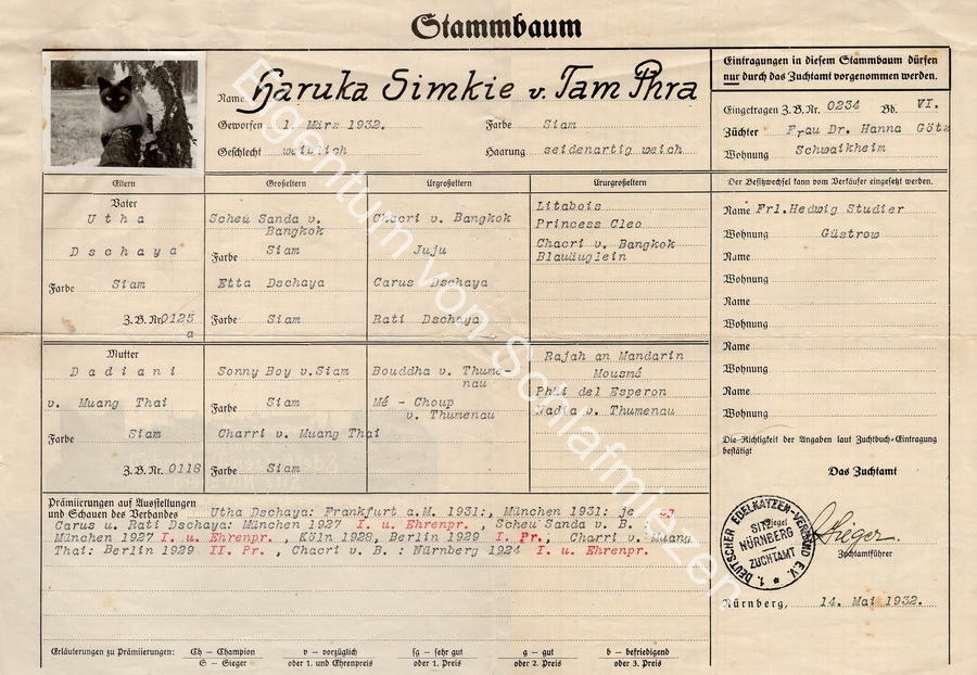Paul Eipper (* 10. Juli 1891 in Stuttgart; † 22. Juli 1964 in Feldafing) ein deutscher Schriftsteller schreibt einen sehr schönen Beitrag über seine eigene Siamkatze und seine Zucht 1935: