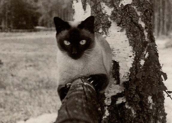 Ich nannte ihn Timur, das klang so nach „Sturm über Asien“, und schließlich stammte er ja aus Siam und war eine männliche Tempel- oder Königskatze. Dies ist nicht so dahingesagt, bitte, der mitgebrachte Personalausweis, die Rolle des Stammbaumes vielmehr, war eineinviertel Meter lang und reichte, was die Züchter angeht, von Tilla Durieux bis zu einer veritablen braunen Prinzessin in Bangkok zurück… Die erste tiefgehende Erfahrung machte mein kleiner Freund, als die Mannbarkeit ihn schmerzlich beunruhigte. ……Man mußte ihn verheiraten, und bald wurde eine gleichfalls singende Braut gebracht: Jael aus hochfürstlichem Stamme, mit dem dreieckigen Schlangenkopf und dem leicht hysterischen Augenausdruck ihres Hauses, in dem es nicht ohne Inzucht hergegangen war, mit leicht gekrümmtem Rücken mißtrauisch daherschreitend, in dieser Stunde ein wahres Rührmichnichtan. Sie hatte den Kater gewittert und biß mir im Flur zur Begrüßung gleich eine Vene durch; dann machte Timur die Zimmertür auf… Solch eine Katzenhochzeit ist oft genug geschildert worden. Scheinbar im gleichen Zeitraum hingen die beiden Tiere oben in einer Gardine, schlugen sich unter dem Tisch und jagten sich kreischend über sämtliche Möbel, ehe es mir gelang, sie zu trennen und schmachten zu lassen, bis es Abend wurde und die Rufe sanfter und klagender wurden. Nach zwei Tagen verschwand Jael wieder, und Timur schien froh, wieder allein zu sein.“