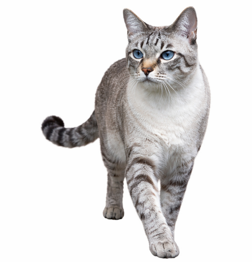 Die seal tabbypoint Körperfarbe und der Fußballen entsprechen den Solidpoint Varianten, während der Nasenspiegel rosafarben mit dunkler Umrandung erscheint.