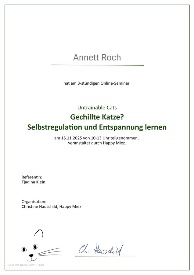 „Entspann dich!“ – sagst du das auch manchmal zu deiner Katze? Einfach gesagt, aber gar nicht so leicht umzusetzen… Vielen unserer Katzen fällt es schwer ihr Erregungslevel zu steuern, und es braucht Übung, damit Entspannung auch in aufregenden Situationen zuverlässig abrufbar ist. In diesem Seminar schauen wir uns an, wie wir unsere Katzen dabei unterstützen können, gute Bewältigungsstrategien für Stress zu finden, und wie wir ihnen helfen können, ihr Erregungslevel zu regulieren und zu mehr Balance und Ausgeglichenheit zu finden.