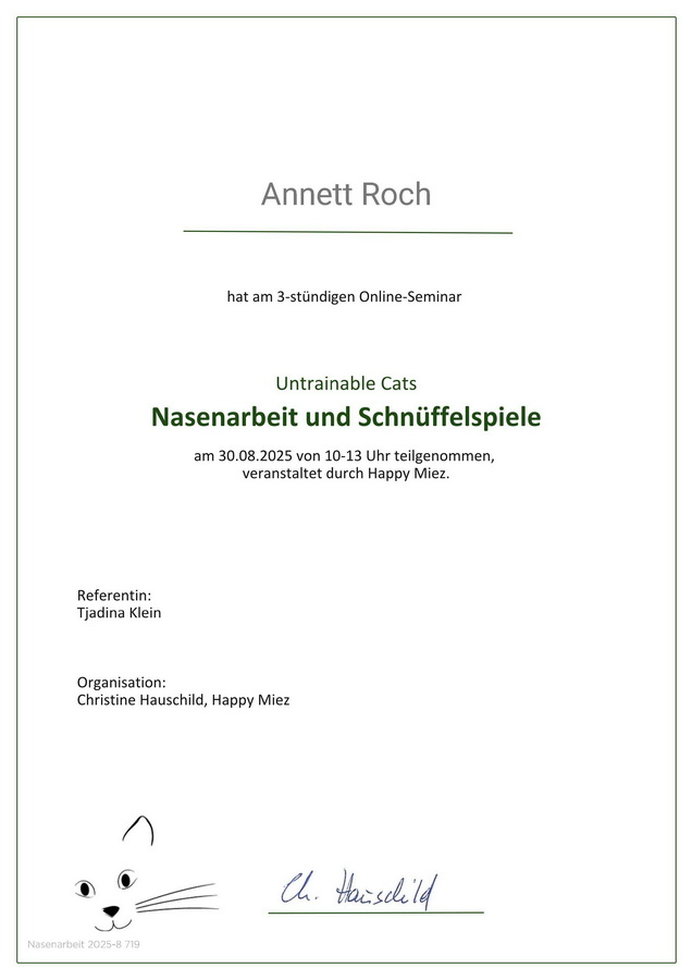 Katzen zu erziehen ist gar nicht so schwer. Mit dem Verständnis für das natürliche Lernverhalten und Wesen der Katze, ist die Erziehung dieser wunderbaren Lebewesen sogar einfach. Mit etwas Abstand von unserer „menschlichen“ Denkweise, und ein wenig mehr Verständnis für die Katze, funktionieren Erziehung und Training spielerisch, stressfrei und sanft. Die artgerechte Erziehung der Katzen ist die Grundlage für den Umgang mit Verhaltensproblemen jeder Art. Die Hauptthemen dieser Veranstaltung sind das natürliche Revier- und Rangordnungsverhalten, das Lernverhalten der Katze mit den wichtigsten Lerntheorien, die Erziehung, Training und einige Beispiel aus dem Alltag. Aber auch die Grundlagen des Clicker-Trainings und Leinentrainings werden besprochen.