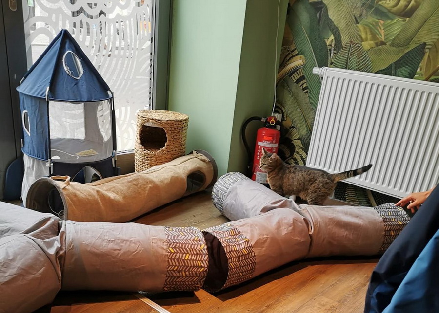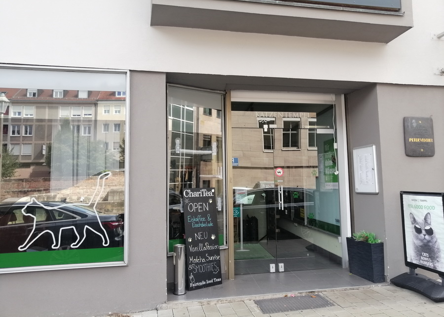 Der Katzentempel in Nürnberg befindet sich mitten in der Altstadt. In dem Café leben sechs „Tempelkatzen“, die alle aus dem Tierschutz stammen. Ein wichtiger Teil des Konzepts ist der Tierschutz: Besucher können sich vor Ort über die Herkunft der Katzen und allgemeine Tierschutzthemen informieren.