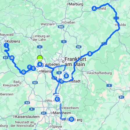 Alsfeld * Gelnhausen * Lorsch * Kloster Eberbach * Eltville * Wiesbaden * Oberes Mittelrheintal * Rüdesheim* Neckarsteinach * Darmstadt * Grube Messel