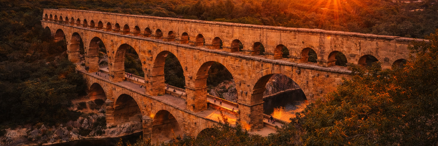 Der Pont du Gard wurde kurz vor Christi Geburt erbaut, um dem fast 50 km langen Aquädukt von Nîmes die Überquerung des Flusses Gard zu ermöglichen. Die römischen Architekten und Wasserbauingenieure, die diese fast 50 m hohe und dreistöckige Brücke – die längste misst 275 m – entwarfen, schufen ein technisches und künstlerisches Meisterwerk.