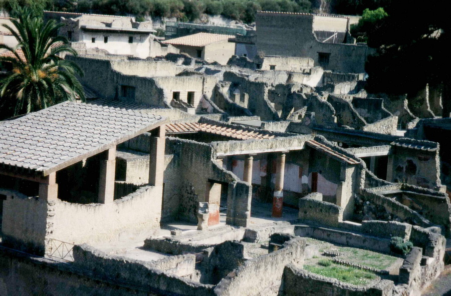 In Herculaneum sind mehrere beeindruckende öffentliche Gebäude gut erhalten, darunter eine geräumige Palästra, die durch ein monumentales Tor zugänglich ist, zwei öffentliche Bäder, von denen eines (die Zentralthermen) monumental und farbenfroh dekoriert ist, das Kollegium der Priester des Augustus und ein Theater in klassischer Form. Die Villa der Papyri außerhalb der Stadtmauern ist ein opulentes Gebäude. Die Stadt ist auch für die Vollständigkeit ihrer Geschäfte bemerkenswert, in denen sich noch Gerätschaften wie riesige Weinkrüge befinden. Die Stadtviertel und die Strandpromenade von Herculaneum sind besser erhalten, insbesondere die oberen Stockwerke sind dank des pyroklastischen Materials, das die Stadt begrub, bemerkenswert gut erhalten. Organisches Material wurde oft durch die hohen Temperaturen verkohlt, und zu den außergewöhnlich gut erhaltenen Funden zählen Alltagsgegenstände wie Lebensmittel, Architekturelemente und Holzmöbel.